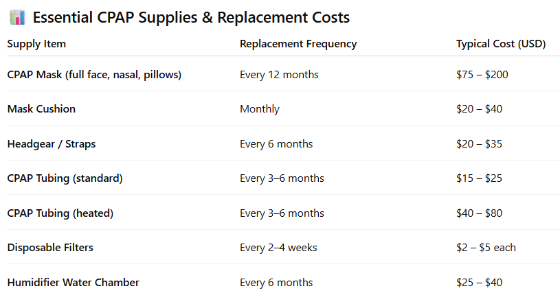 Ongoing costs include replacement masks, cushions, filters, tubing, and humidifier chambers. Budget approximately $25 to $75 per month for supplies.