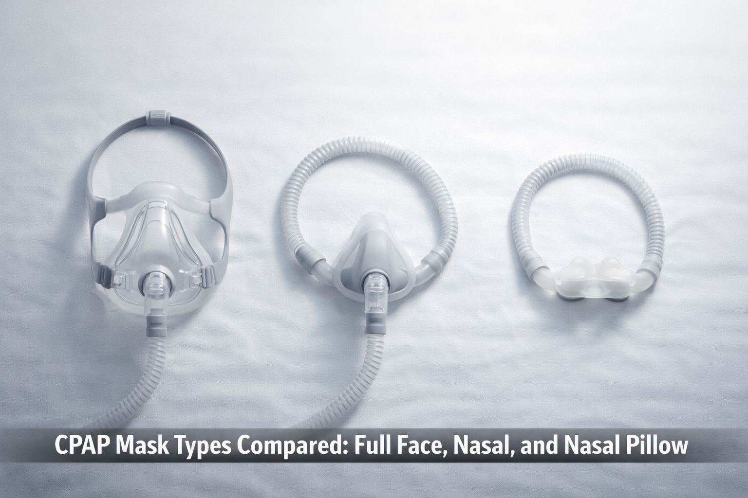 The three main CPAP mask types are full face masks, which cover both the nose and mouth; nasal masks, which cover the nose only; and nasal pillow masks, which seal directly at the nostrils with small cushioned inserts. Each type suits different breathing styles, facial structures, and sleeping positions.
