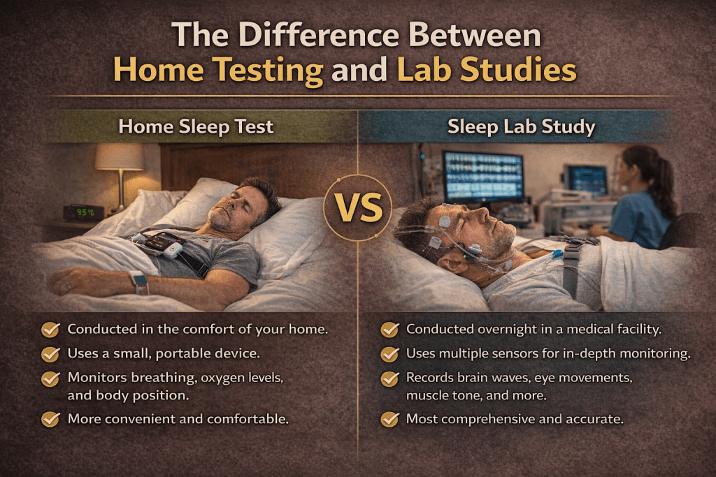 Sleep studies can be conducted in a clinical lab or, increasingly, in the comfort of your own home. A home sleep test uses a small, portable device that monitors your breathing, oxygen saturation, and other key metrics while you rest in your own bed. It is a simpler, more accessible option that works well for evaluating breathing-related concerns.