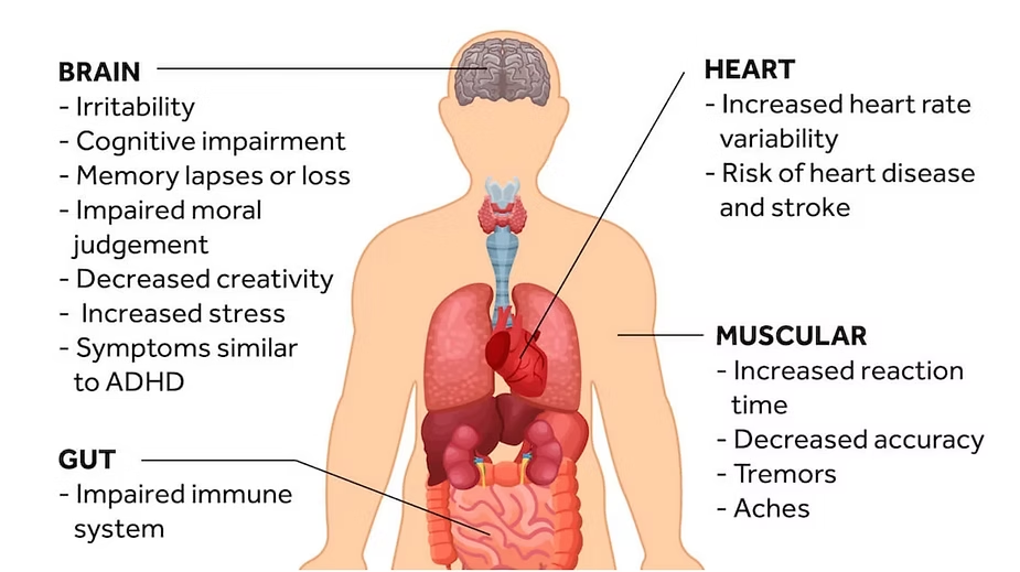 Over time, poor sleep increases the risk of heart disease, high blood pressure, metabolic problems, and weakened immune system function. Disrupted sleep patterns interfere with the sleep-wake cycle, causing fatigue, brain fog, and reduced productivity.