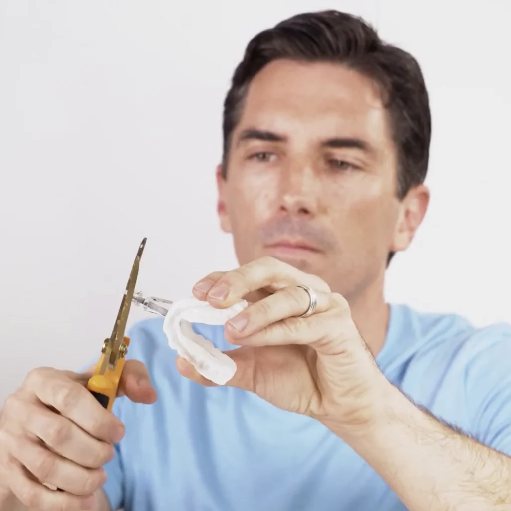 Submerge the upper tray in boiling water for one minute until the thermoplastic becomes completely clear. Remove with tongs and wait 20 seconds for it to cool slightly. Place the tray over your upper teeth, aligning the adjustment post with the center of your lips. Bite down firmly for one minute while pressing your tongue against the inner sidewalls to create suction. Use your fingers along your jawline to flatten excess material over your molars. Keep the tray in your mouth for three more minutes as it cools and hardens.