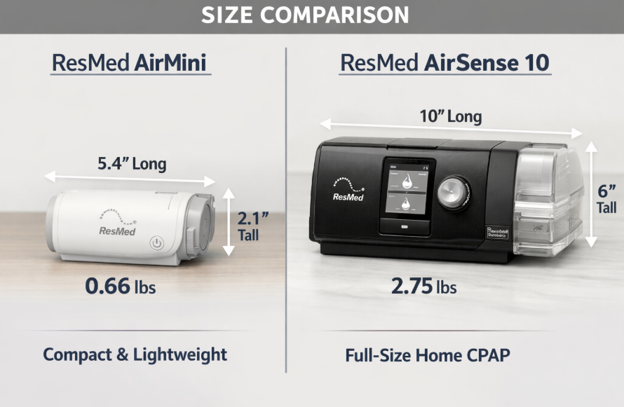 The ResMed AirMini measures 5.4 inches long, 3.3 inches wide, and 2.1 inches tall. At just 0.66 pounds (300 grams or 10.6 ounces), it weighs less than most smartphones. For comparison, a standard home CPAP machine like the ResMed AirSense 10 weighs 2.75 pounds and measures roughly 10 by 5 by 6 inches.