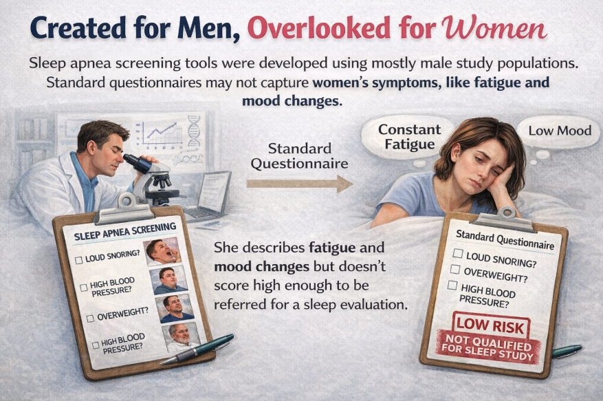 First, many screening tools were developed using male-dominant study populations. The questionnaires and risk assessments commonly used in clinical settings may not capture the symptoms women are most likely to report. A woman who describes fatigue and mood changes may not score high enough on a standard screening to be referred for a sleep evaluation.