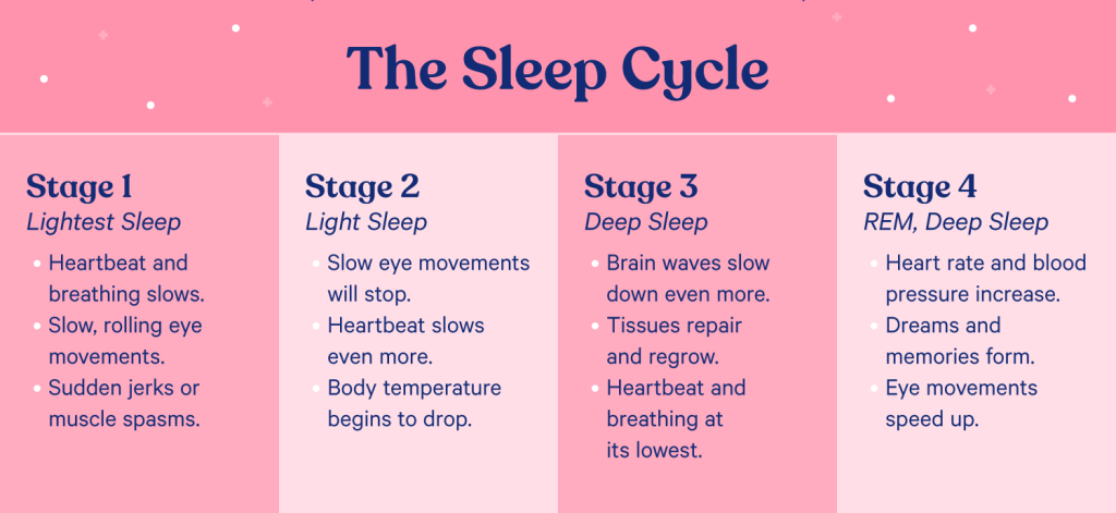 The restorative power of sleep comes from what happens inside those hours, not from the total count. Sleep cycles through distinct stages approximately every 90 minutes. Each cycle includes light sleep, deep slow-wave sleep, and REM sleep.